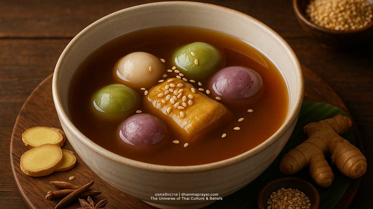 ความหมาย: บัวลอยหมายถึงชีวิตที่ราบรื่น ส่วนขิงสื่อถึงสุขภาพที่แข็งแรง